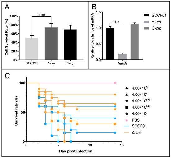 Cytotoxicity tests were carried out to evaluate the pathogenic role of ECPs secreted by the WT, Δcrp, and C-crp strains. The survival rate of Δcrp cells at 24 h was found to be substantially higher than that of the WT strain (72.29 ± 11.97% vs. 52.41 ± 6.99%) (Figure 6A). The mRNA level of metalloproteinase gene hapA was significantly decreased (Figure 6B. Meanwhile, an injection challenge was conducted. Figure 6C displays the survival curves for each group. The time of death occurred 2–8 days following infection. At 4.00 × 106 and 4.00 × 105, there were significant differences. In addition, the LD50 of Δcrp was 1.85 × 106 CFU/mL, which is 73.1 times higher than the LD50 of the wild type, which is 2.53 × 104 CFU/mL. Therefore, the cumulative mortality via the injection challenge method was considerably reduced by deletion of the crp gene.