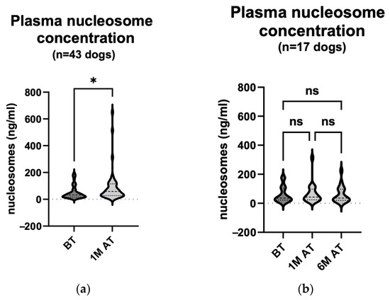 - Wilson-Robles, H.M.; Bygott, T.; Kelly, T.K.; Miller, T.M.; Miller, P.; Matsushita, M.; Terrell, J.; Bougoussa, M.; Butera, T. Evaluation of plasma nucleosome concentrations in dogs with a variety of common cancers and in healthy dogs. BMC Veter. Res. 2022, 18, 329. [Google Scholar] [CrossRef] [PubMed]