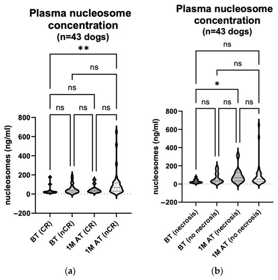A comparison between the response to treatment one month after treatment and changes in the plasma nucleosome concentrations showed no correlation. On the other hand, the presence of enhanced tumour necrosis at the same time point correlated significantly positively with the plasma nucleosome concentrations. Nucleosomes are predominantly located within cells and are released into the bloodstream, particularly upon activation or cell death [36]. This may explain the increase in the plasma nucleosome concentrations in patients where ablative techniques such as ECT with IL-12 GET were used for treatment, resulting in tissue inflammation and the necrosis of the tumour. In a recent study, Wilson-Robles et al. examined the nucleosome levels in 528 dogs with various common malignancies and compared them to 134 healthy dogs. Although elevated nucleosome levels have been found least frequently in soft tissue sarcomas, osteosarcomas and MCT [35], we could hypothesize that the increase in the plasma nucleosome concentration is due to tumour tissue degradation, regardless of the tumour type. Very similar changes in the nucleosome concentration during treatment with either radiotherapy or chemotherapy have been observed in human medicine in various malignancies [64,65,66]. The fluctuation in the plasma nucleosome concentration should be further investigated in different tumour types in dogs.
