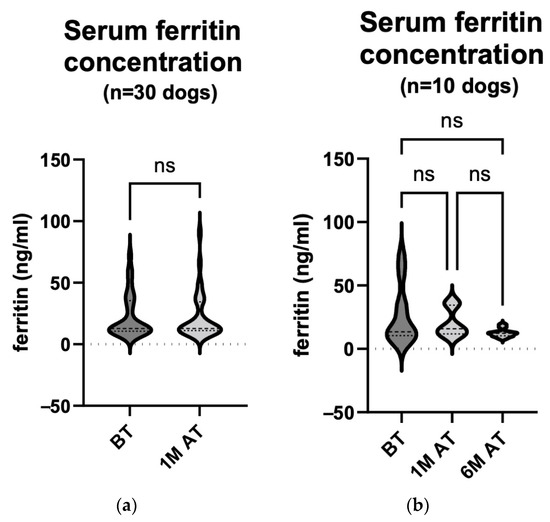Ferritin, a protein involved in intracellular iron storage and cell protection, is found in high concentrations in the liver, spleen, and bone marrow of mammals [45,46,47]. High serum ferritin levels are influenced by conditions such as iron overload, inflammatory diseases, liver damage and malignant tumours [48]. Malignant tumours have been shown to produce and release ferritin, leading to an increase in serum ferritin levels [26,49]. Elevated serum ferritin levels have also been observed in clinical studies in tumour patients and have been attributed to reduced iron utilisation during tumour development [29,50]. In veterinary medicine, elevated serum ferritin concentrations are observed in dogs with lymphomas, histiocytic sarcomas, mammary tumours, immune-mediated haemolytic anaemia (IMHA) and liver disease [26,27,28,29].