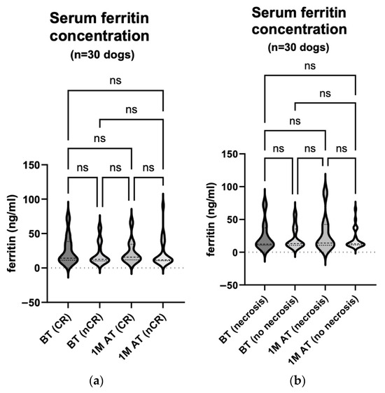 In summary, this study investigated the potential of plasma nucleosome and serum ferritin concentrations, as well as serum LDH activity, to be used as biomarkers for predicting the response to treatment of dogs with MCT using a combination of ECT and IL-12 GET. The plasma nucleosome concentration and serum LDH activity were found to be promising early indicators of treatment effects, especially in animals with enhanced tumour necrosis (Figure 1b), but their long-term predictive value needs further investigation. The serum ferritin concentration showed no significant predictive potential for the treatment response in this context.