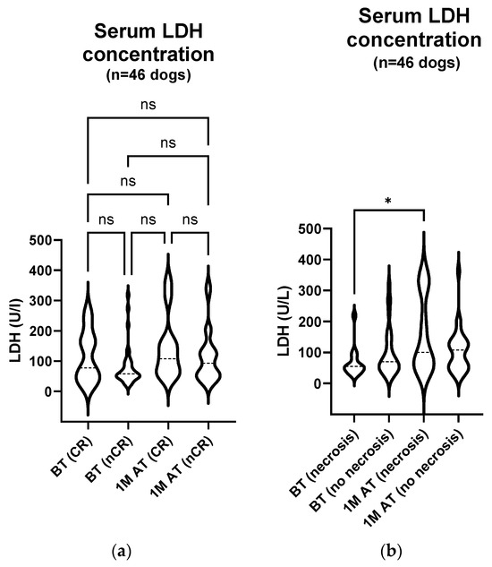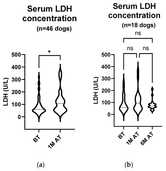 In our study, a significant increase in the serum LDH activity was observed in 46 patients one month after treatment. We also observed changes in the LDH activity six months after treatment, albeit in a smaller group of 18 dogs examined at this time. However, in these 18 dogs, there was no significant change in the serum LDH activity six months after treatment, either compared to the pre-treatment values or compared to the period one month after treatment. Furthermore, a comparison of the LDH activity between the day of treatment and one month after treatment also showed no significant difference in these 18 dogs. As mentioned with regard to the plasma nucleosome concentration, it is important to consider the potential impact of the small sample size on these observations.