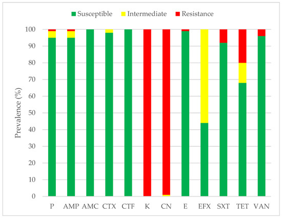 Antimicrobial susceptibility profile of S. agalactiae (n = 100). Abbreviations: P: penicillin; AMP: ampicillin; AMC: amoxicillin; CTX: cefotaxime; CTF: ceftiofur; K: kanamycin; CN: gentamicin; E: erythromycin; EFX: enrofloxacin; SXT: sulfamethoxazole-trimethoprim; TET: tetracycline and VAN: vancomycin.