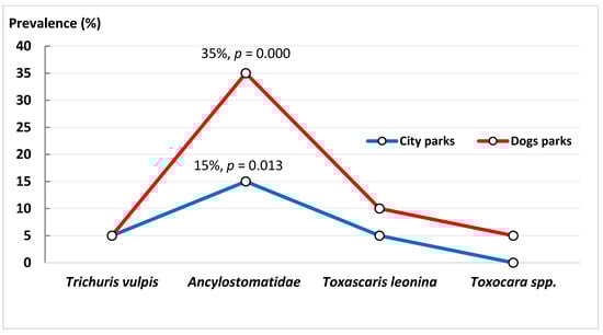 The prevalence of Ancylostomatidae in the analyzed city parks of the district of Wola was about 15.0% (χ2 = 8.73, df = 2, p = 0.013), whereas in the dog parks, the prevalence was 35.0% (χ2 = 37.20, df = 2, p = 0.000) (Figure 1). The difference in prevalence between the two types of sites was statistically significant (χ2 = 10.67, df = 1, p = 0.002). Therefore, a higher percentage of hosts infected by Ancylostomatidae was noted for dog parks in the district of Wola. Of note, Toxocara spp. was excluded from statistical analysis since it was found in only one dog park and in one host, and was not found at all in city parks.