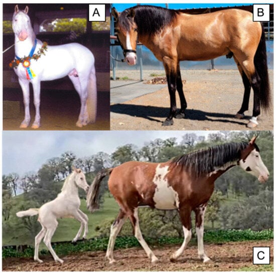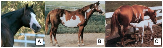 Common phenotypes of Paint horses with Lethal White Overo (LWO). (A) LWO/n individual displays a blue eye and white blaze (photograph by M. Simmons). (B) Jagged body marks as a result of one copy of LWO. (C) All white homozygous LWO foal and a heterozygous LWO mare. The photographs in (B,C) were adapted from []).