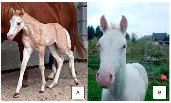 - Pulos, W.L.; Hutt, F.B. Lethal Dominant White in Horses. J. Hered. 1969, 60, 59–63. [Google Scholar] [CrossRef] [PubMed]