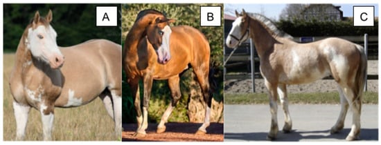 Common splashed white markings. (A) Paint horse with SW7 displaying typical splashed markings on the face, legs, and body and blue eyes. This individual was reported as deaf and possesses one Cream variant diluting the coat color. Image adapted from []. (B) Pura Raza Española horse with SW9 displaying blue eyes, four white limbs, and a white face. (C) Franches-Montagnes horse with the Macchiato variant, which causes a phenotype similar to splashed white and a coat color dilution similar to Cream. This individual was reported to not carry any coat dilutions other than Macchiato. Image adapted from [].