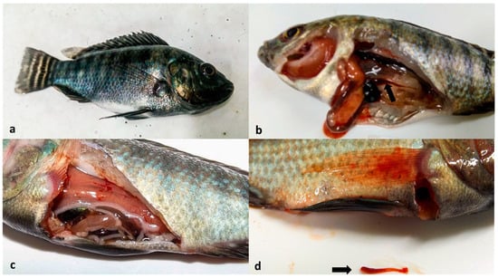 Moribund animals from the infected group showing melanosis (a), gill pallor (b), visceral pallor (c), and spleen hypoplasia (arrows in (b,d)).