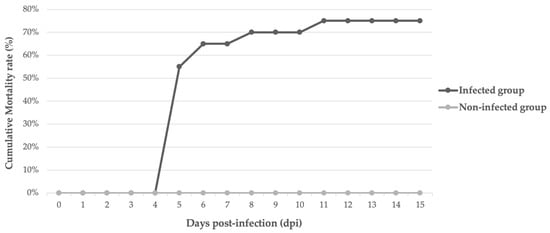 Daily mortality rates during the experimental period are shown in Figure 2. The first mortality was recorded on the fifth day post-infection and marked the peak of daily mortality, with 11 dead fish (55%). Two animals died on day six (65%), one on day eight (70%), and one on day eleven (75%). All animals in the group infected with active homogenates showed positive results for the virus in the qPCR analysis for ISKNV.