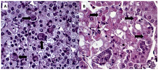 Histological sections of the kidney of Nile tilapia (Oreochromis niloticus) experimentally infected with ISKNV. Megalocytes in the spleen can be seen with the presence of intracytoplasmic basophilic bodies (arrows) and apoptotic figures (white arrowheads). H&E, 60× magnification (A); Histological fragment showing a region of renal cortex, represented by renal tubules with the presence of hyaline degeneration and increased cytoplasmic volume, with the presence of intracytoplasmic eosinophilic corpuscles. H&E, 60× magnification (B).