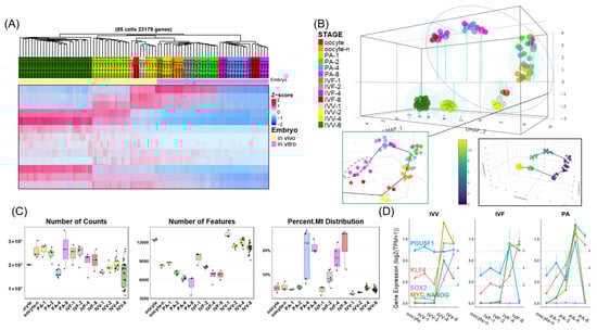 Further exploring the expression characteristics, we created box plots of the total gene expression, the number of different genes, and the percentage of mitochondrial (MT) gene expression for each sample (Figure 1C). The results showed an increase in mitochondrial gene expression and a decrease in gene variety across the 1–8-cell stages (Figure 1C). Compared to the sudden increase and heterogeneity of in vitro embryos at the four-cell stage, the MT percentage in in vivo embryos was more stable (Figure 1C). In vitro embryos generally exhibited a higher total gene expression across stages, while the number of genes during the 1–8-cell stages (potentially reflecting developmental status and potential) was generally lower, with PA embryos showing the least gene diversity (Figure 1C).
