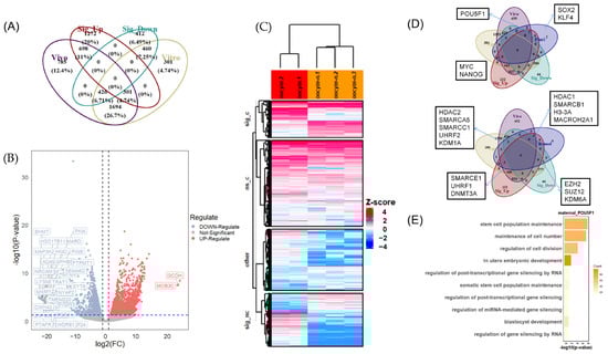 Maternal mRNA set definition and differential analysis between in vivo and in vitro matured oocytes. (A) Venn diagram showing the interrelationships among four gene sets: ‘Vivo’ represents the gene set in IVV oocytes with FPKM > 10; similarly, ‘Vitro’ pertains to the gene set in IVF oocytes. ‘Sig_Up’ denotes the gene set significantly upregulated in in vivo oocytes compared to in vitro oocytes, and, conversely, ‘Sig_Down’ refers to genes that are significantly downregulated. (B) Volcano plot annotated with the 10 genes that exhibit the highest and the lowest log2-fold changes, respectively. (C) Heatmap of gene expression across all oocyte samples, segmented according to the significance of gene expression differences. ‘sig_c’ denotes the genes with significant differential expression found in the common intersection between the Vivo and Vitro groups. ‘sig_nc’ represents genes with significant differential expression outside of the common intersection. ‘nc_s’ indicates the nonsignificant portion within the common intersection, and ‘other’ refers to the remaining genes not categorized in the aforementioned groups. It should be noted that this heatmap is globally normalized in contrast to other heatmaps in the study, which are normalized by row. (D) Top: Venn diagram illustrating the overlap between the four gene sets from diagram A and the pluripotency factor set. Bottom: Venn diagram depicting the intersection between the four gene sets from diagram A and a subset of genes related to chromatin remodeling. (E) GO enrichment results for POU5F1 in the maternal mRNA milieu of in vivo matured oocytes.