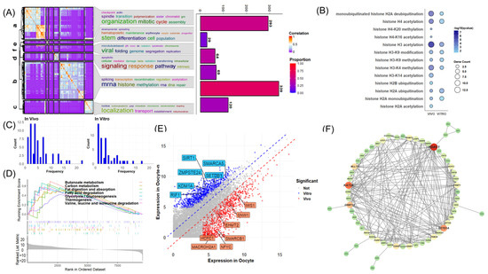 Enrichment analysis of differential maternal mRNA and comprehensive gene screening. (A) Left: GO terms derived from the enrichment analysis of the in vivo maternal mRNA set were chosen based on their correlation with significantly expressed in vivo genes. Subsequently, these terms were categorized into six distinct clusters (labeled a–f), and each cluster is depicted through a word cloud, highlighting the prevalence of various biological processes. Right: a bar chart displays the number of GO terms and the proportion of associated genes within each category. (B) Bubble chart showing GO terms related to histone modifications from category C for in vivo matured oocytes and category B for in vitro matured oocytes, derived from GO enrichment and clustering of differentially expressed genes. (C) From left to right: distribution charts illustrate the number of GO terms associated with each gene in the ‘remod’ collections in in vivo matured oocytes and in vitro matured oocytes, respectively. (D) GSEA plot showing important KEGG terms related to energy metabolism in in vivo matured oocytes compared to in vitro, with a threshold of NES > 1 and FDR < 0.25. (E) Scatter plot illustrating the correlation between the expression levels (log2(TPM + 1)) of genes in in vivo matured oocytes and in vitro matured oocytes. Genes with over 8 and 10 associated GO terms are labeled, respectively. (F) The protein–protein interaction (PPI) plot of ‘remod’ collections in in vivo matured oocytes.