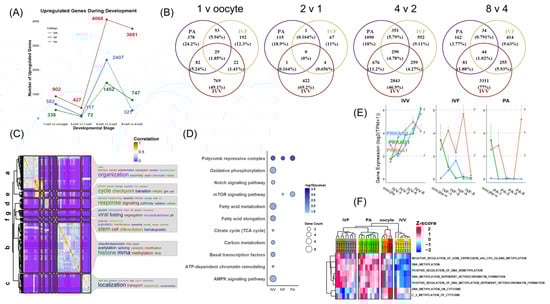 Differential analysis of adjacent stages from 1–8-cell stages and enrichment analysis of minor ZGA. (A) Line chart depicting the number of significantly upregulated genes from IVV, IVF, and PA embryos based on differential analyses of adjacent cell stages spanning from oocyte to 8-cell stages (threshold: FDR < 0.05, log2FC > 1). (B) Venn diagram illustrating the overlapping of significantly upregulated genes from differential analysis of adjacent stages spanning from oocyte to 8-cell stages among IVV, IVF, and PA. (C) GO terms resulting from the enrichment analysis of a gene set that combines the minor ZGA gene set of IVV and the maternal mRNA set from in vivo matured oocytes were selected based on their correlation with the significantly upregulated genes independent of PA and IVF. These terms were subsequently categorized into six distinct clusters (labeled a–f), and each cluster was represented by a word cloud highlighting the prominence of different biological processes. (D) Bubble chart depicting KEGG terms related to energy metabolism and chromatin remodeling of independently significantly upregulated genes during minor ZGA among IVV, IVF, and PA. (E) From left to right: expression trajectories of PRKAG1, PRKAG2, and PRKAA1 from the oocyte–8-cell stages in the IVV, IVF, and PA embryos, respectively. The black line represents the average level. (F) GSVA of GO terms related to DNA methylation from the oocyte to 2-cell stages among IVV, IVF, and PA.
