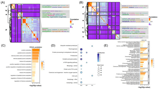 Enrichment analysis of major ZGA. (A) GO terms resulting from the enrichment analysis of independently, significantly upregulated genes during IVV major ZGA at the 2–4-cell stage, focusing on those terms that are distinct and independent of IVF and PA. These selected terms were then categorized into four distinct clusters (labeled a–d), and each cluster was visually represented as a word cloud, emphasizing the prominence of various biological processes. (B) GO terms resulting from the enrichment analysis of significantly upregulated genes during IVV major ZGA at the 4–8-cell stage. These selected terms were also categorized into six distinct clusters (labeled a–f), with each cluster visually depicted as a word cloud to highlight the diversity of biological processes. (C) The bar chart displays GO terms related to acetylation, which are part of category b in Panel (A). (D) Bubble chart depicting KEGG terms of significantly upregulated genes during major ZGA at the 2–4-cell stage among IVV, IVF, and PA. (E) The bar chart displays GO terms of significantly upregulated genes during major ZGA at the 4–8-cell stage in IVV.