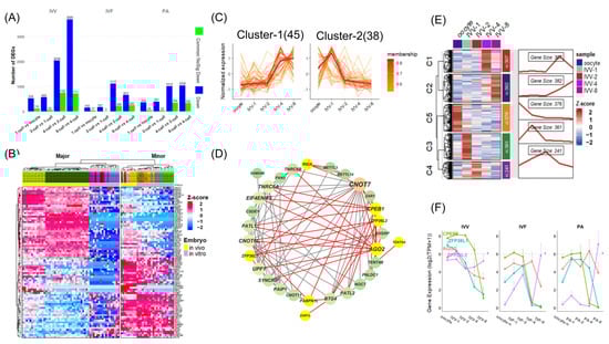Differences in mRNA degradation in in vivo and in vitro embryos. (A) This panel shows the number of all significantly downregulated genes from oocytes to the 8-cell stage in each adjacent phase in blue, and the degradation of the non-significant-difference common set of maternal mRNAs in in vivo and in vitro embryos is represented in green. (B) A heatmap of gene expression for maternal mRNA degradation-related genes from the oocyte to the 8-cell stages in three types of embryos: IVV, IVF, and PA. (C) Clustering results for maternal mRNA degradation-related genes. (D) PPI network displaying the interactions among genes in Cluster 2 from Panel (C). The network is marked in bright yellow and red connections to denote genes that are significantly upregulated in in vivo matured oocytes compared to in vitro matured ones and their interactions. (E) From left to right: expression heatmaps and clustering results for the non-significant-difference common set of maternal mRNAs in in vivo and in vitro embryos, from the oocyte to the 8-cell stages. (F) From left to right: expression trajectories of AGO2, KHSRP, ZFP36L1, ZFP36L2, and CPEB1 from the oocyte–8-cell stages in the IVV, IVF, and PA embryos.