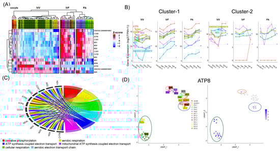 Differences in mitochondrial genes in IVV, IVF, and PA embryos. (A) A heatmap of gene expression for mitochondrial encoding genes from the oocyte to the 8-cell stages in three types of embryos: IVV, IVF, and PA. (B) Expression trajectories of mitochondrial encoding genes clustered by hierarchical clustering as shown in Panel (A). (C) Chord diagram displaying clustered GO enrichment results for mitochondrial encoding genes. (D) From left to right: UMAP of all samples, and expression feature maps for the ATP8 gene across different stages and types of embryos.