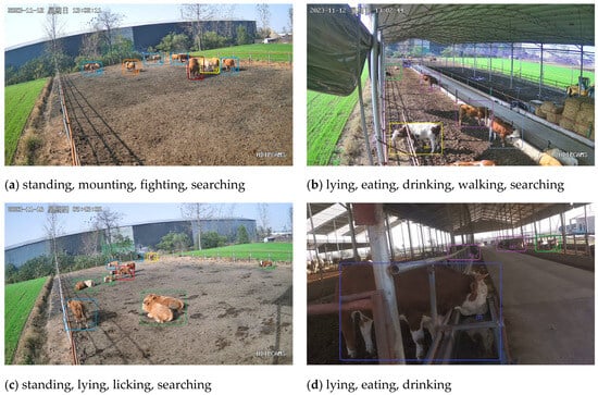 In order to acquire more effective data on beef cattle behavior, this study captured videos of daily cattle behavior in different scenarios over a span of 7 days (11–17 November 2023). These videos aimed to comprehensively reflect various characteristics of beef cattle behavior. Simultaneously, manual annotations were applied to segments of videos depicting nine behaviors of beef cattle: standing, lying, mounting, fighting, licking, eating, drinking, walking, and searching. The video durations varied from 1 to 30 min. The recognition rules and examples for the nine beef-cattle behaviors are presented in Table 1.