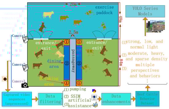 As indicated in Figure 2, the beef cattle facility primarily comprises an exercise paddock, entrances and exits, a dining area, and a drinking area, denoted as (1) for the drinking area and (2) for the dining area. The process of beef cattle behavior collection and processing is outlined as follows: (1) initial video sequences of beef cattle are captured with cameras. Cameras 1 and 2 are fixed at designated positions (Figure 1a–c), capturing overall cattle behavior. Camera 3 is manually positioned (Figure 1d), capturing localized features of beef cattle behavior. (2) Data filtering involves preprocessing the collected video sequences through three main steps: firstly, frame subsampling to reduce the similarity between adjacent frames; secondly, enhancing data diversity through Structural Similarity (SSIM) [] technology; and finally, a manual auxiliary filtering process. Details are provided in the subsequent Section 2.1.2. (3) Data augmentation: following data filtering, the selected data undergo augmentation to expand the dataset. Refer to the subsequent section, Section 2.1.2, for specific details. (4) Input to the YOLOv8n Series Improvement Algorithm: the beef cattle behavior dataset, encompassing different lighting conditions (strong light, low light, and normal light), varied density levels (moderate, heavy, and sparse), and multiple angles of cattle behavior, is input into the YOLOv8n series improvement algorithm.