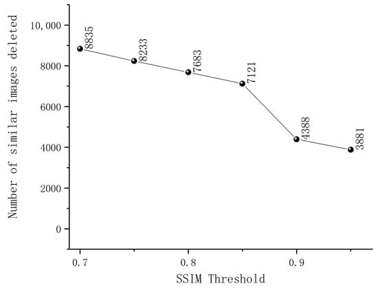 The criterion for selecting sample images using SSIM is that a higher SSIM value indicates smaller differences between the two images and a higher image similarity. After data frame extraction, the dataset comprised 12,215 frames. As shown in Figure 3, the SSIM curve remains relatively stable within the SSIM threshold ranges of 0.7–0.85 and 0.9–0.95. However, within the SSIM threshold range of 0.85–0.9, the curve exhibits a noticeable decline. This suggests that images within this threshold range exhibit significant similarity, and at an SSIM threshold of 0.85, the maximum number of similar images is eliminated. Therefore, this study set the SSIM threshold at 0.85. If the SSIM value between two sample images is greater than 0.85, it indicates a high level of similarity, and only one of the sample images is retained; otherwise, all images are preserved.