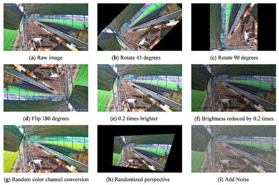 The collected data were filtered and integrated, resulting in a total of 4320 frames of valid images representing nine categories of beef cattle postures. Subsequently, the original dataset underwent various data augmentations, including clockwise rotations of 45 and 90 degrees, a 180-degree flip, brightness adjustments of +0.2 and −0.2, random color channel transformations, random perspective changes, and the addition of noise. This data augmentation process expanded the experimental samples to eight times their original size, as illustrated in Figure 4. The applied data augmentations enhanced the algorithm’s ability for object detection in complex scenes, providing more information on beef cattle posture characteristics. For instance, random color channel transformation can simulate changes in lighting conditions, introducing image noise and mitigating the impact of lighting factors to enhance algorithm robustness. Finally, the experimental samples were divided into training and testing sets in an 8:2 ratio.