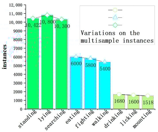 In the training of a model on a dataset, the quantity of instances for each category plays a crucial role in the algorithm’s training. Figure 5 illustrates the distribution of instance quantities for each category in the training set. From the bar chart, it can be observed that the instances of beef cattle standing, lying, and engaging in searching behavior are approximately 10,500, while instances of eating, fighting, and walking behaviors are around 5800. Instances of drinking, licking, and mounting behaviors are approximately 1600. The line chart reveals that the instances for standing, lying, and searching behaviors, as well as eating, fighting, and walking behaviors, and drinking, licking, and mounting behaviors, remain stable. The frequency of the nine cattle behaviors generally aligns with the daily farming activities of beef cattle, indicating a reasonable distribution of samples in the dataset. This distribution provides valuable data support for subsequent algorithm models to explore features of beef cattle behavior.
