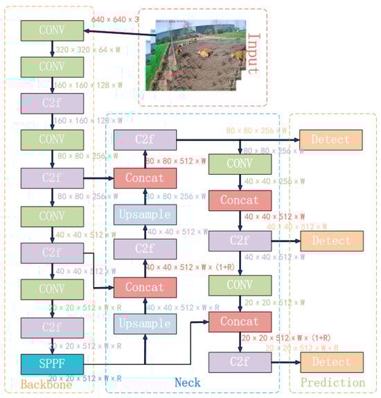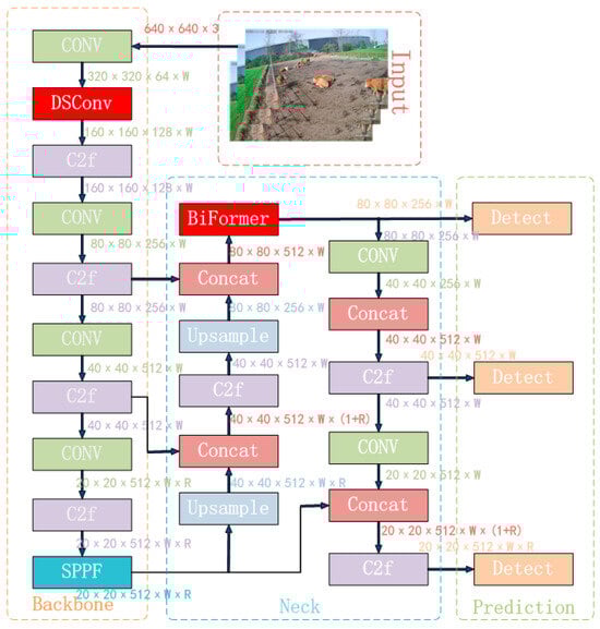 The YOLOv8 is the latest SOTA single-stage object detection algorithm, integrating and optimizing the essence of the YOLO series algorithms [,,,]. YOLOv8 innovates in the backbone network, detection head, loss function, and other aspects, resulting in varying degrees of improvement in detection accuracy compared to YOLOv5, YOLOv6, and YOLOv7 []. Simultaneously, YOLOv8 provides a unified model training framework, greatly enhancing the algorithm’s scalability. To meet different scene requirements, YOLOv8 offers five model versions: YOLOv8n, YOLOv8s, YOLOv8m, YOLOv8l, and YOLOv8x. These models increase in depth and width based on YOLOv8n. Among them, the YOLOv8n model is the smallest and has the fastest detection speed, while the YOLOv8x model is the largest, with the highest detection accuracy but the slowest speed. Considering the application of beef cattle posture recognition in practical projects, the YOLOv8n model, which is the smallest, was chosen. Its structure mainly consists of four parts: the input network, the backbone network, the neck network, and the output network.