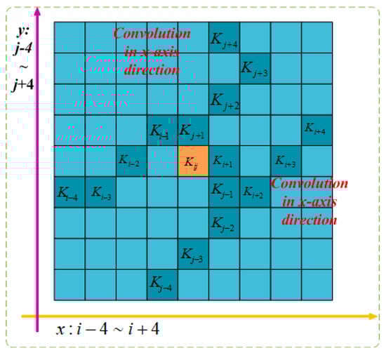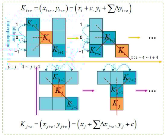 Here, K represents the fractional positions in Equations (2) and (3), and K′ enumerates all integral spatial positions. B is the bilinear interpolation kernel, which is decomposed into two one-dimensional kernels, as follows: