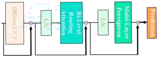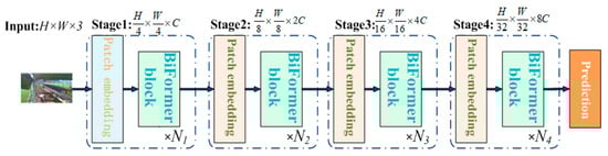 Based on the BRA module, a novel universal vision transformer called BiFormer is constructed using the four-level pyramid structure of a vision transformer [], as illustrated in Figure 10.