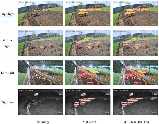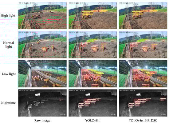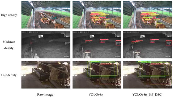 Different levels of beef cattle density result in varying degrees of cattle occlusion and significant differences in background interference factors. Generally, the density of cattle is negatively correlated with image feature points and positively correlated with image feature noise. Consequently, the recognition effectiveness of beef cattle behavior varies with different levels of cattle density. This paper selects three scenarios of cattle farming—moderate density, high density, and low density—to compare recognition performance with the original YOLOv8n and validate the feasibility of beef cattle behavior recognition using YOLOv8n_BiF_DSC. The comparative results are shown in the following figure.