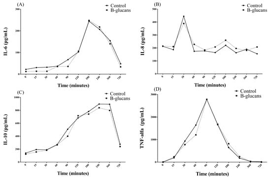 Figure 1. Changes in the mean concentrations of IL-6 (A), IL-8 (B), IL-10 (C) and TNF-α (D) over time in the control group and β-glucan group.