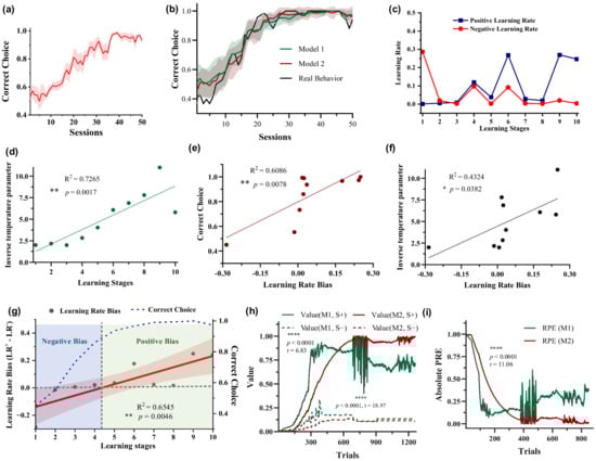 Asymmetric learning rates have been studied in the context of reinforcement learning [4]. From the perspective of RL, learning rate bias refers to the difference in learning rates used for positive reward prediction errors and negative reward prediction errors. These learning rates refer to the difference in how animals learn from positive and negative reward prediction errors during the learning process. Research has shown that animals learn differently from positive and negative prediction errors, indicating an asymmetry in learning rates [5,6]. The phenomenon where the positive learning rate exceeds the negative learning rate is referred to as positive learning rate bias, while the opposite is known as negative learning rate bias. Positive learning rate bias indicates a greater emphasis on positive prediction errors, reflecting an enhanced learning response to unexpected rewards or better-than-expected outcomes. Conversely, negative learning rate bias refers to a greater sensitivity to negative prediction errors, highlighting a heightened response to unexpected punishments or worse-than-expected outcomes. Both positive and negative learning rate biases play significant roles in the adaptive learning and decision-making behavior of animals. These potential learning rate biases can be explained by risk-seeking/aversion behavior [7] or cognitive bias [8]. Previous studies have examined the asymmetry of learning rates across species [5,9], task contexts [10,11], and outcome types [6]. Many studies suggest that asymmetric learning rates tend to be biased in the direction of learning from positive RPEs, compared with negative RPEs [4,12]. Other studies indicate that negative learning rates are higher than positive learning rates [7,9]. However, all of these studies generally assume that the asymmetry remains stable throughout the learning process. How learning rate biases dynamically adjust as the learning process progresses remains to be investigated further.