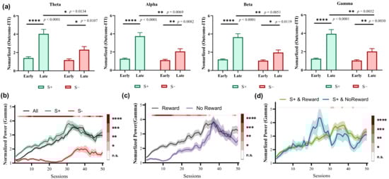 The average power of four bands integrated over a time window of 0.5 s after the outcome presentation was computed to investigate the correlation between the striatal LFP activity and different options. We found that the power in all four bands during the late learning stage was significantly higher compared with the early stage when choosing S+ trials (Figure 3a, p < 0.0001). Moreover, the greatest difference in Gamma band was observed between the late and early stages when choosing S− trials (Figure 3a, * p = 0.0107 for Theta, ** p = 0.0082 for Alpha, * p = 0.0119 for Beta, ** p = 0.0030 for Gamma). Further, significant power differences were observed in all four bands between choosing S+ and S− trials during the late learning stages (Figure 3a, * p = 0.0134 for Theta, ** p = 0.0069 for Alpha, ** p = 0.0051 for Beta, ** p = 0.0032 for Gamma). Considering that the most significant differences lie in the Gamma band, we focused on Gamma to explore the dynamic power changes throughout the entire learning process. As shown in Figure 3b, the power gradually increased with each session and reached its peak during the late stages before slightly decreasing. The increased Gamma power was primarily driven by selecting S+ trials, while no significant increase was observed for selecting S− trials during the early stages. The power is significantly greater for trials of choosing S+ than for choosing S− trials during almost the entire learning process (Figure 3b). Figure 3c shows the changes of Gamma power between rewarded and unrewarded trials. It is observed that the power of rewarded trials is significantly higher than that of unrewarded trials during the early stages. However, this difference disappears in the late stages. Furthermore, there is almost no significant difference in power between rewarded and unrewarded trials of choosing S+ (Figure 3d). These results show that Gamma power modifications in the striatum of pigeons are differentially modulated by the choice, and may be involved in representing option values during learning processes.