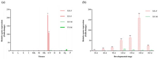 Gene expression analysis of CmFigla in different tissues of four types of C. maculata (n = 3) (a) and in the gonads of XX-F and XY-M individuals at different developmental stages (n = 3) (b). Values are expressed as mean ± SD. ** means extremely significant difference (p < 0.01).