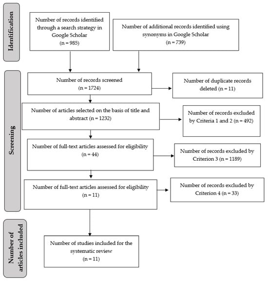 For selection based on criteria 1 and 2, the titles and abstracts of 1724 articles were analyzed (Figure 1). To verify criterion 3, the 44 articles resulting from the previous process were organized in a matrix to analyze their objectives, methodology, results, and conclusions (Table S2). Applying all the pre-established eligibility criteria, 1713 articles were discarded, leaving a total of 11 articles (Figure 1, Table S3).