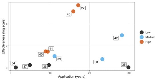 Effectiveness of the control technique in relation to years of application and community engagement level. Colors represent varying levels of community engagement, with numbers corresponding to article identities (ID) (see Table S2 and S3).