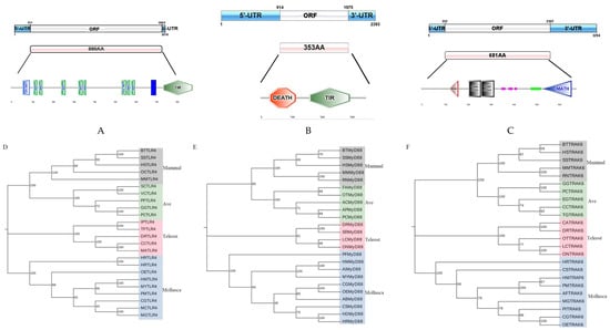 HMTLR4, HMMyD88 and HMTRAF6 genes in scallop “Hongmo No. 1” and phylogenetic trees of their putative proteins. (A–C) Schematic presentation of HMTLR4, HMMyD88 and HMTRAF6, respectively. Sky-blue and white boxes show transcript UTRs and their ORF. Pink box show putative proteins. In predicted amino acid sequences, conserved domains were labeled with texts and different colors. (D–F) Phylogenetic trees based on the predicted amino acid sequences of HMTLR4, HMMyD88 and HMTRAF6, respectively. Species names are abbreviated as BT for Bos taurus, SS for Sus scrofa, HS for Homo sapiens, OC for Oryctolagus cuniculus, MM for Mus musculus, RN for Rattus norvegicus, SC for Serinus canaria, VC for Vidua chalybeata, PF for Patagioenas fasciata monilis, GG for Gallus gallus, PC for Phasianus colchicus, FA for Ficedula albicollis, OT for Onychostruthus taczanowskii, AC for Acanthisitta chloris, AP for Anas platyrhynchos, EG for Egretta garzetta, CC for Cyanistes caeruleus, TG for Taeniopygia guttata, IP for Ictalurus punctatus, TF for Tachysurus fulvidraco, DR for Danio rerio, CC for Cyprinus carpio, MA for Megalobrama amblycephala, SR for Sinocyclocheilus rhinocerous, LC for Larimichthys crocea, ON for Oreochromis niloticus, CA for Carassius auratus, OT for Oncorhynchus tshawytscha, PF for Pinctada fucata, AI for Argopecten irradians, AB for Anadara broughtonii, HD for Haliotis diversicolor, CS for Cyclina sinensis, HR for Haliotis rufescens, OE for Ostrea edulis, MY for Mizuhopecten yessoensis, PM for Pecten maximus, CG for Crassostrea gigas, MC for Mytilus californianus, MG for Mytilus galloprovincialis, AF for Azumapecten farreri and PI for Pinctada imbricata.