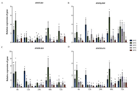 Expression profiles of HMTLR4 (A), HMMyD88 (B), HMIRAK4 (C) and HMTRAF6 (D) in gills of scallops at different temperatures. Bars represent standard deviation. For statistical analysis, a separate one-factor analysis of variance (ANOVA) was performed at each time point and levels were accepted as significant if p value < 0.05. The different letters indicate significant differences in gene expression between groups at the same time point.