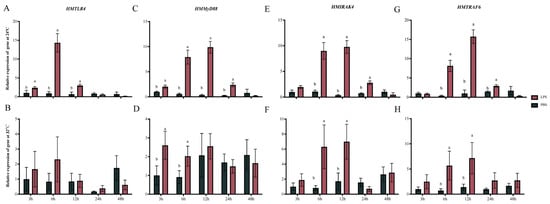 Besides the three genes above, the expression patterns of another gene in the TLR4-MyD88 pathway, interleukin receptor associated kinase 4 (HMIRAK4), were also investigated. For a clear understanding about the tissue specificity of gene expression, the expression of four genes in the TLR4-MyD88 pathway were detected in the gill, adductor muscle, mantle and hemolymph of scallops sampled from the control group (24 °C) at 0 h. The relative expression of HMTLR4 in the mantle was the highest among the four kinds of tissues, and the expression of HMTLR4 in the gill was also significantly higher than that in the adductor muscle and hemolymph (Figure S4A). As for HMMyD88, HMIRAK4 and HMTRAF6, they showed similar expression patterns, and their transcripts in gill tissue were the most abundant (Figure S4B–D).