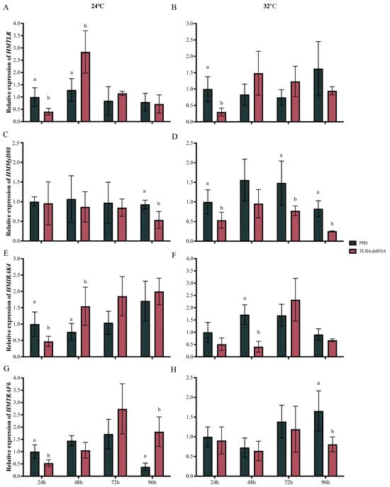 Then, we tested the effect of HMTLR4 suppression on the expression of its downstream genes, HMMyD88, HMIRAK4 and HMTRAF6. At 24 °C, HMMyD88 did not show significant differences in transcript abundance until 96 h after injection with dsRNA targeting HMTLR4 (Figure 4C). By contrast, when scallops were injected with dsRNA targeting HMTLR4 at 32 °C, the expression of HMMyD88 was significantly lower than that in the control group, except at 48 h after injection (Figure 4D). When HMTLR4 was silenced at 24 °C, HMIRAK4 showed similar expression trends within 96 h (Figure 4E). But, at 32 °C, a significant decrease appeared later at 48 h after injection (Figure 4F). As for the expression of HMTRAF6, it decreased immediately at 24 h but showed a higher level than that in the control group at 72 h after injection with dsRNA at 24 °C (Figure 4G). At 32 °C, there was no significant difference in the expression of HMTRAF6 between the PBS and dsRNA treatment groups within 72 h, and a lower expression level of HMTRAF6 in scallops injected with dsRNA appeared at 96 h (Figure 4H).