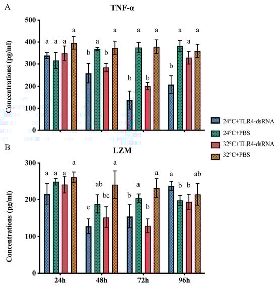 Levels of TNF-α (A) and LZM (B) in gills of scallops injected with dsRNA targeting HMTLR4 at 24 °C and 32 °C. Bars represent standard deviations. Statistical analyses were carried out by one-way ANOVA and levels were accepted as significant if p value < 0.05. The different letters indicate significant differences between groups at the same time points.