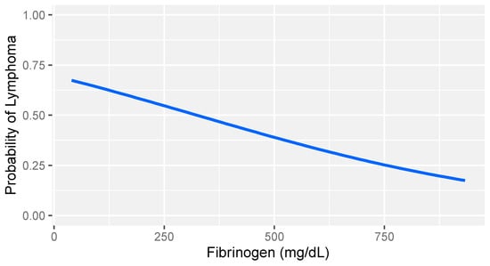 In consideration of the non-parametric distribution of all study variables (Shapiro–Wilk normality test: <0.001), differences between the two groups were analyzed through a Wilcoxon sum rank test for independent samples. A comparative analysis between dogs with lymphoma and sick dogs without lymphoma revealed notable hemostatic abnormalities, including prolonged prothrombin time (PT), decreased fibrinogen, increased FDPs levels, reduced thrombin time (TT), and decreased platelet counts (Table 3). Logistic regression analysis identified fibrinogen and platelet count as the strongest predictors of lymphoma (Table 4). More specifically, higher fibrinogen levels and greater platelet counts were associated with a lower likelihood of lymphoma compared to that of other diseases in dogs (Figure 1 and Figure 2).