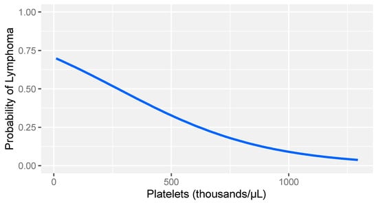 Logistic regression model: probability of lymphoma versus other diseases based on platelet count levels in dogs with stage V lymphoma. The gray band represents the 95% confidence interval.