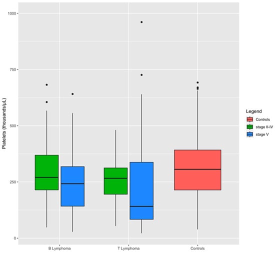 A comparison between dogs with lymphoma stages II to IV and those with stage V lymphoma revealed that the severity of the disease significantly impacts hemostatic test alterations (Table 5). Specifically, dogs with stage V lymphoma exhibited substantially higher levels of FDPs and were more prone to thrombocytopenia compared to dogs with stage II to IV lymphoma. Additionally, they demonstrated prolonged PT and reduced antithrombin activity (Table 5). Box plots demonstrate the impact of lymphoma stage on platelet levels within the immunophenotypes. Dogs with stage V lymphoma exhibited the lowest median platelet count compared to those with stage II–IV lymphoma (Figure 3).
