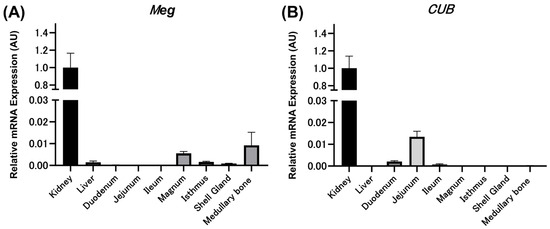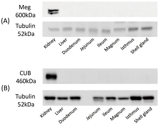 3.3. Expression of Meg and CUB Proteins in Various Tissues of Mature Laying Hens by Western Blotting