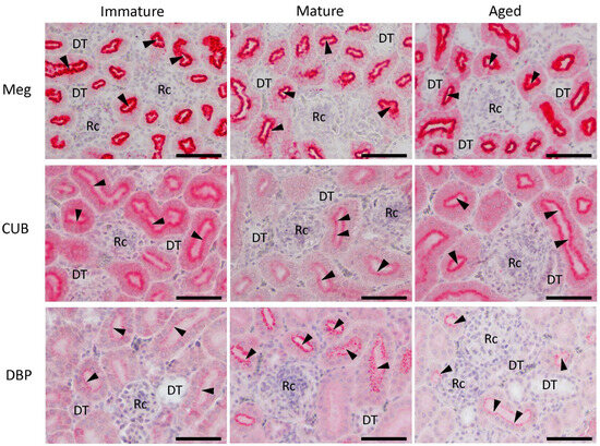 - Odera, K.; Goto, S.; Takahashi, R. Age-related change of endocytic receptors megalin and cubilin in the kidney in rats. Biogerontology 2007, 8, 505–515. [Google Scholar] [CrossRef] [PubMed]
