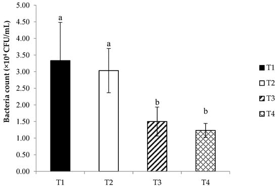 Streptococcus agalactiae counts after incubation with serum of Nile tilapia fed different concentrations of C. rotundus: T1 (0—control), T2 (0.4 g/kg diet), T3 (0.8 g/kg diet), and T4 (1.6 g/kg diet) for 60 days. Data are given as mean ± SD and different superscripts are significant differences (p < 0.05).