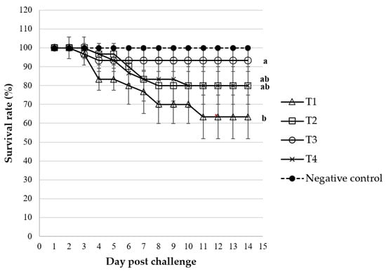 Percentage of survival rate of Nile tilapia fed different concentrations of C. rotundus: T1 (0.0—control), T2 (0.4 g/kg diet), T3 (0.8 g/kg diet), T4 (1.6 g/kg diet), and negative control (injected with PBS) for 14 days post the challenge test with Streptococcus agalactiae. Data are given as mean ± SD and different superscripts are significant differences (p < 0.05).