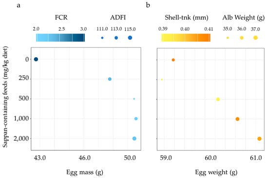 Bubble diagram of functional enrichment analysis for productive performance (a) and egg quality (b) in late phase of laying cycle 1–8 weeks after diet supplementation by Caesalpinia sappan extract with a series of doses in the range 0–2000 mg/kg diet.