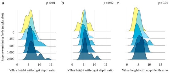 Ridgeline plot of the villus height with crypt depth ratio in different intestinal segments of the duodenum (a), jejunum (b), and ileum (c) from late-phase laying hens at 8 weeks following diet supplementation with Caesalpinia sappan extract ranging from 0 to 2000 mg/kg diet. The p-values were determined by analyzing the Kruskal–Wallis H test among the groups in each of the different intestinal segments.